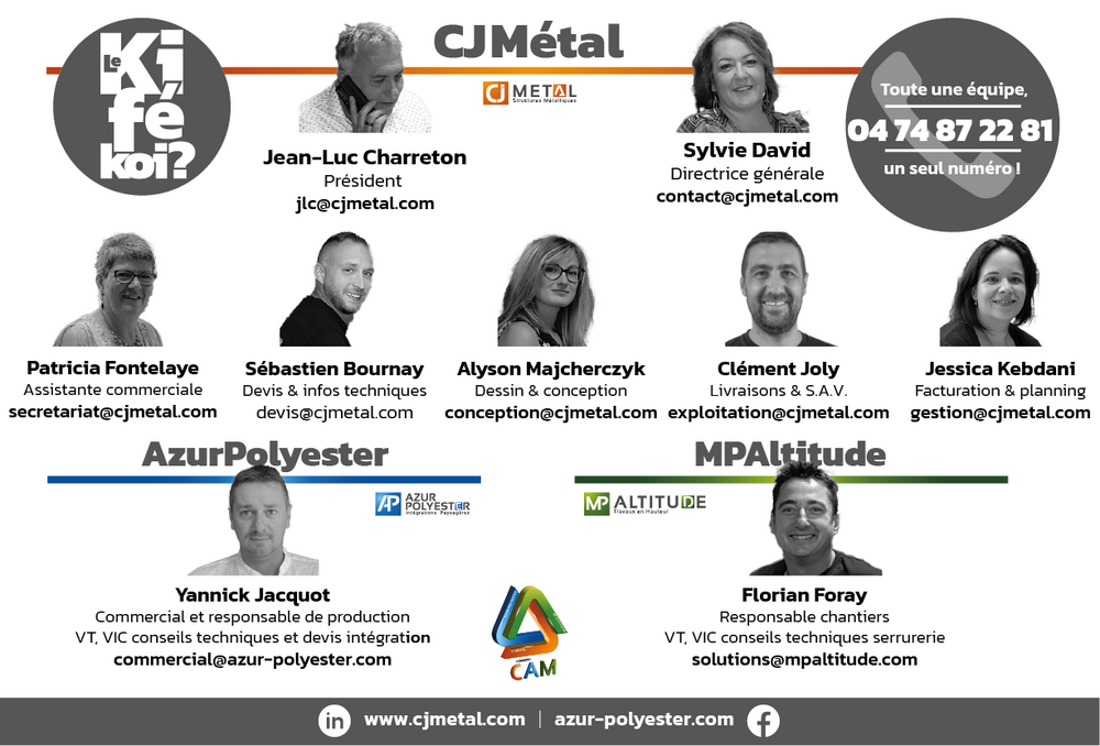 Voici donc les coordonnées de vos interlocuteurs CJ Métal, Azur Polyester et MP Altitude. Un interlocuteur pour chacune de vos demandes vous est dédié, n’hésitez pas à les contacter !